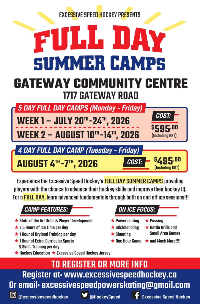 Experience the Excessive Speed Hockey Summer Full Day Camp , providing players with the chance to advance their hockey skills and improve their hockey IQ. For a FULL DAY, learn the advanced fundamentals through both on and off ice sessions!!! You have not experienced a full day camp quite like this one!!!